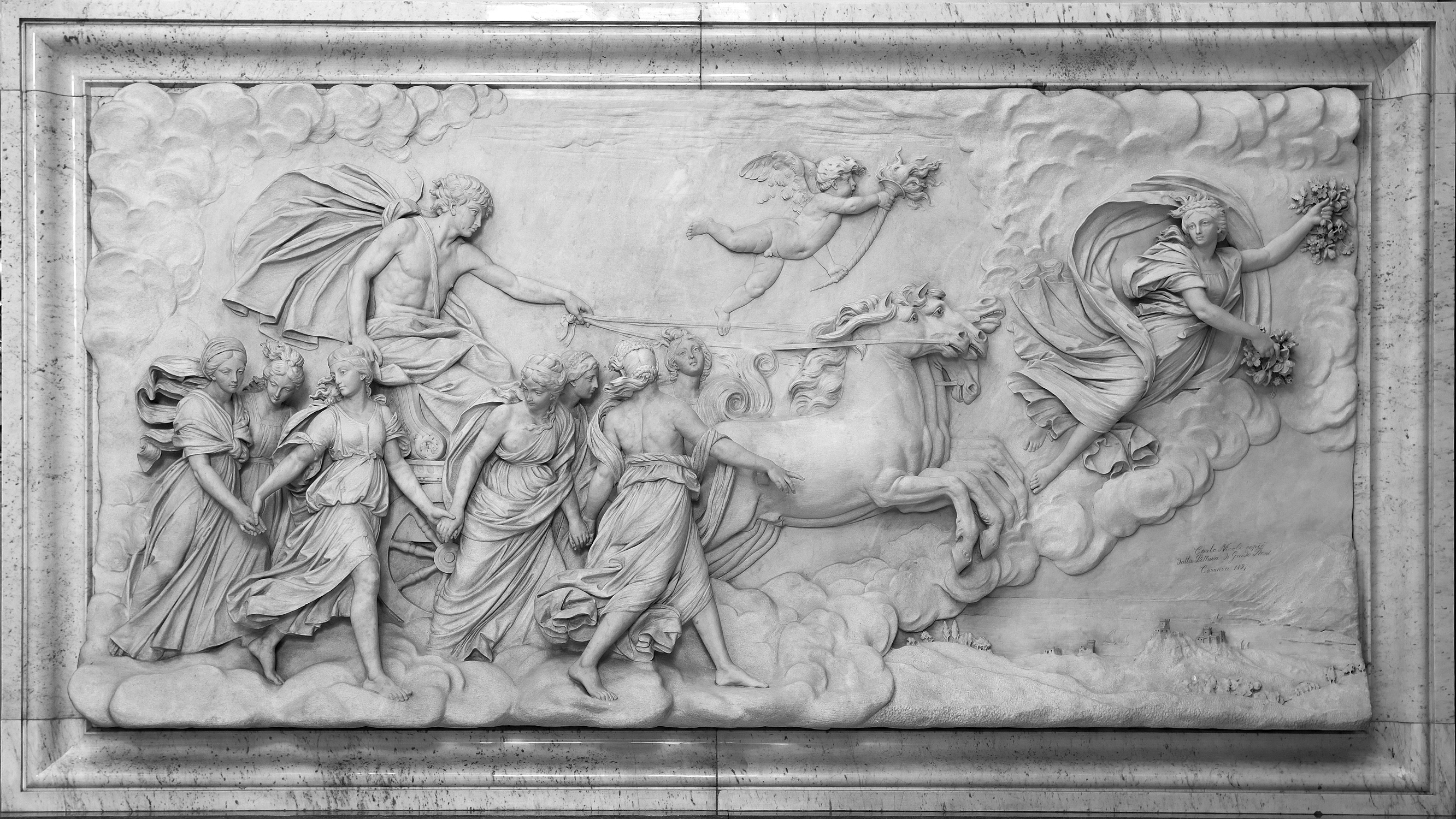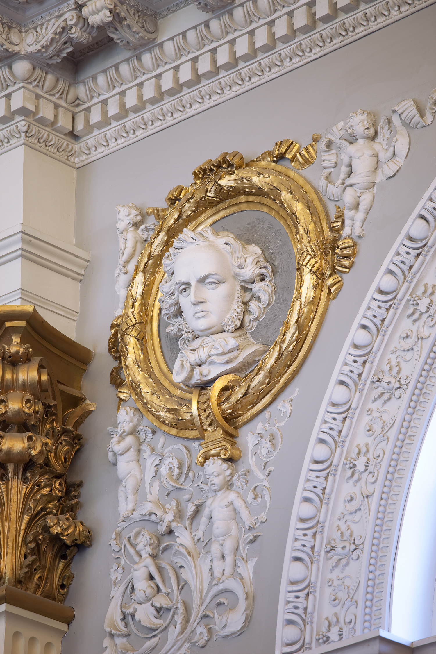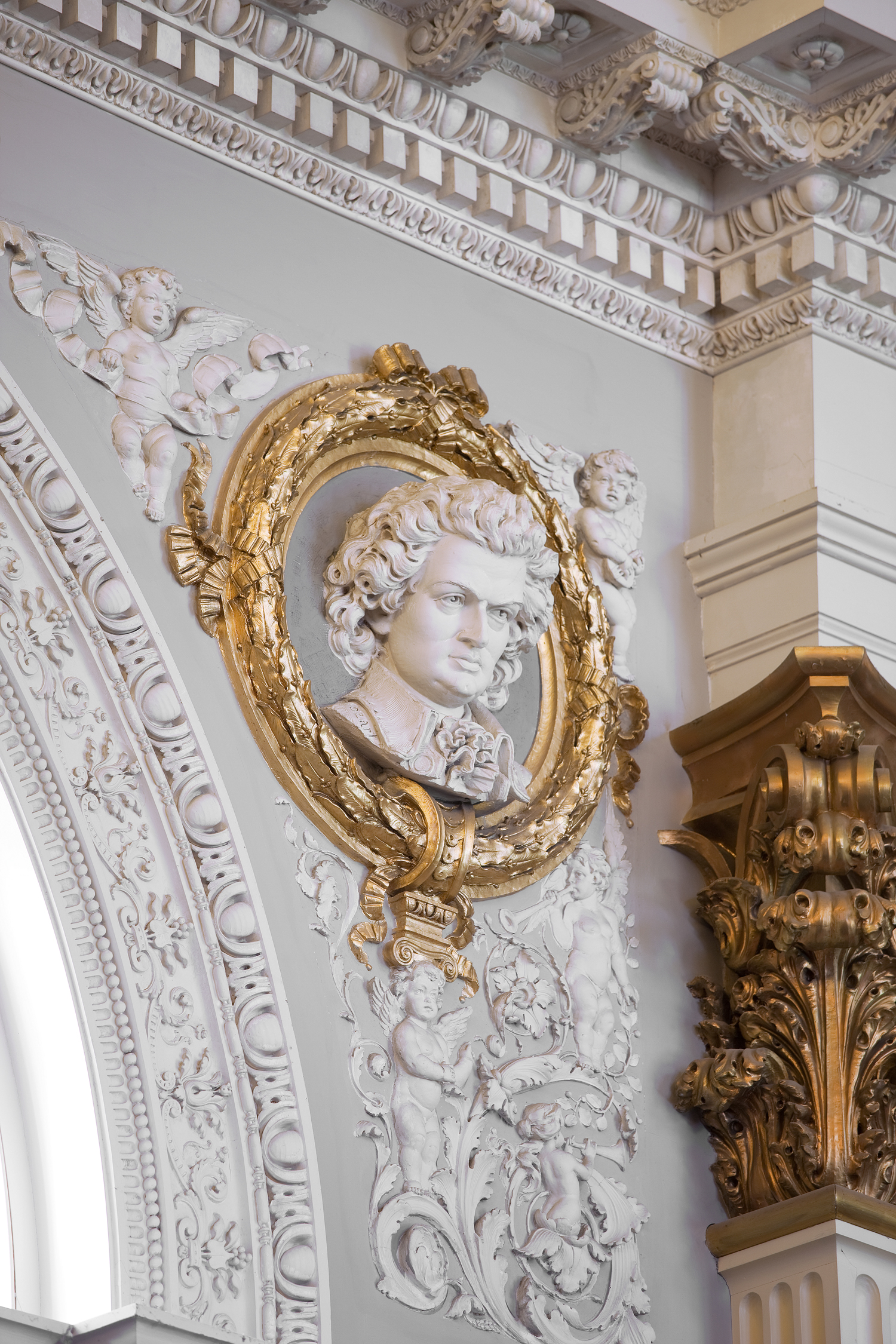 The floors are laid with large marble tiles, the walls are dark oak panels with opulent brocade above, and Corinthian style pilasters add to the classical feeling of the space. The most striking of all the architectural features is the 65-foot-high Roman barrel vault ceiling, laden with an exuberance of plaster details highlighted by gilded accents.